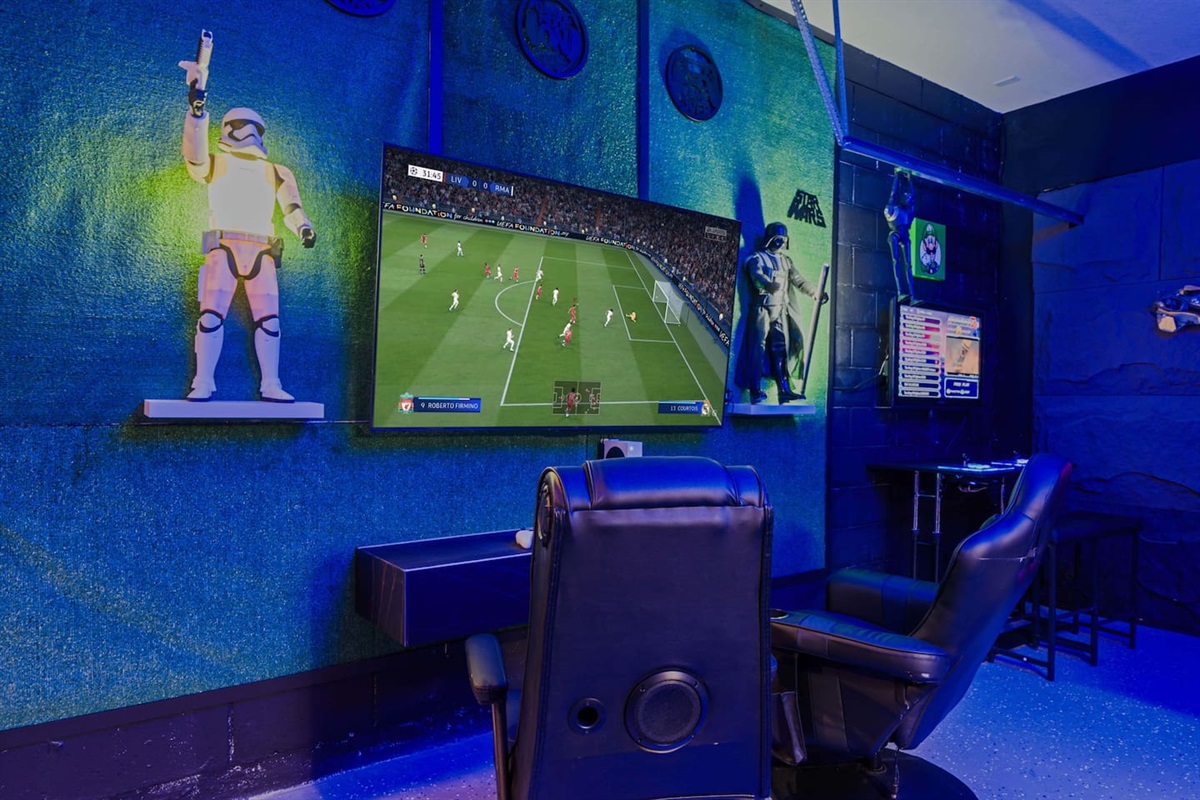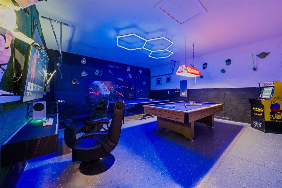- Star Wars themed Games room with table tennis, pool table, TV with S Series XBox, Arcade games with over 3000 games and a Pacman arcade